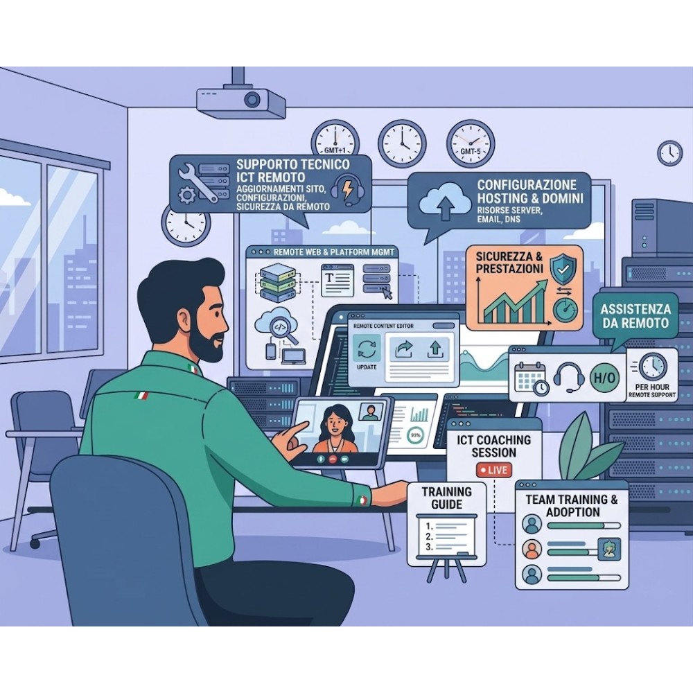 Il servizio di Assistenza da Remoto e Coaching ICT è pensato per aziende, professionisti e team che desiderano gestire in autonomia il proprio sito web e le tecnologie digitali, ma con il supporto costante di esperti. Grazie a sessioni da remoto, è possibile ricevere assistenza immediata e indicazioni pratiche per affrontare ogni esigenza digitale in modo efficace.