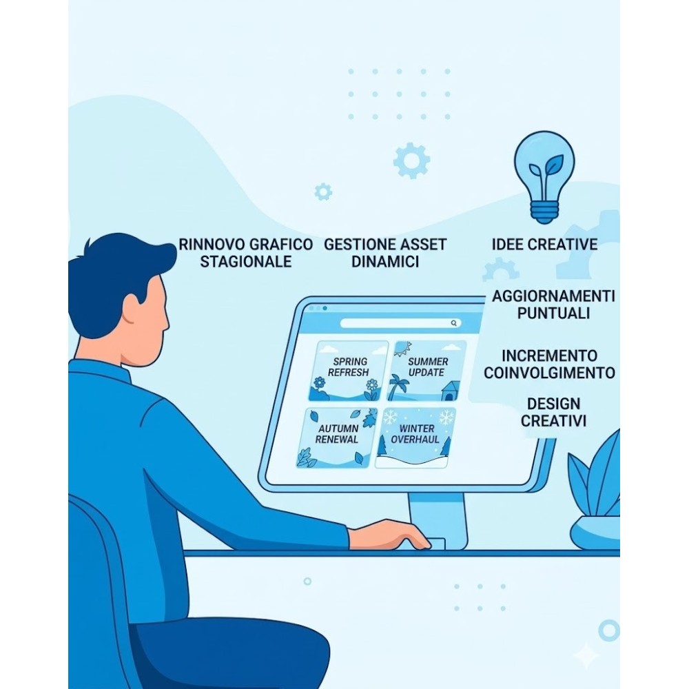 Il servizio prevede un aggiornamento grafico 4 volte l’anno, adattando la home page alle diverse stagioni o momenti dell’anno. Questo permette di offrire un’immagine sempre fresca e in linea con il contesto, valorizzando contenuti, promozioni o messaggi specifici. Un sito aggiornato trasmette maggiore fiducia e rende la comunicazione più coinvolgente ed efficace.