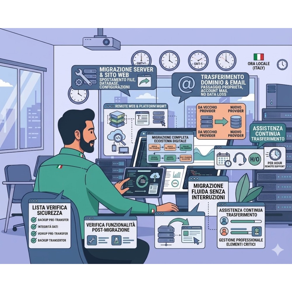 Il trasferimento comprende anche la migrazione del sito web, con tutti i file, i database e le configurazioni necessarie per farlo funzionare correttamente sul nuovo provider. Grazie a un approccio professionale, la migrazione avviene in modo fluido, preservando contenuti, funzionalità e impostazioni esistenti.